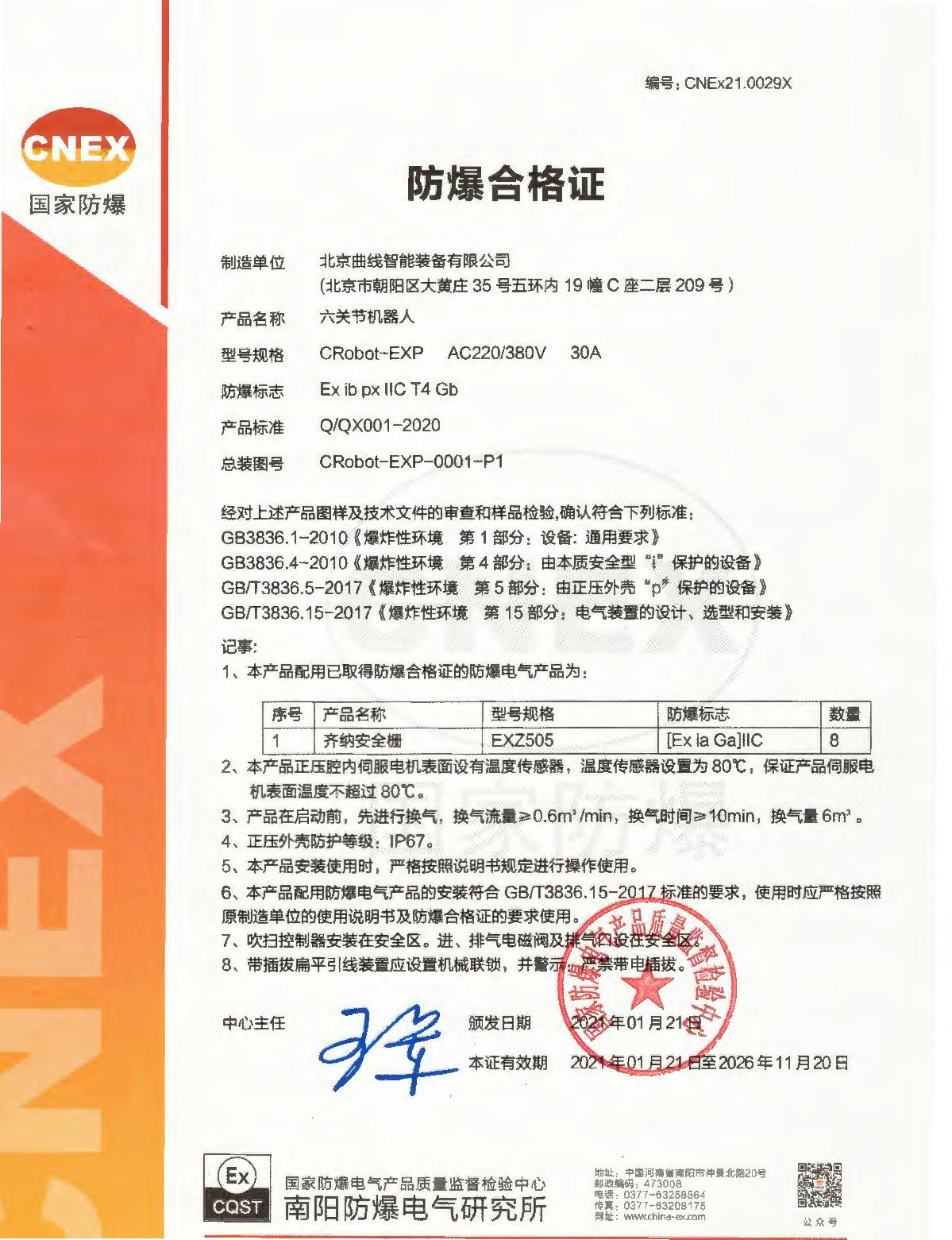 Recently, the six-axis spraying robot (model CR8-2600) independently developed by Curve Intelligence has passed the certification of the National Explosion-proof Electrical Products Quality Supervision and Inspection Center (Nanyang Explosion-proof Electrical Research Institute), obtained the explosion-proof certificate (explosion-proof mark Ex ib px ⅡC T4 Gb), and the protection level reaches IP65, which marks the addition of a "strong player" to our company's spraying robot product series.