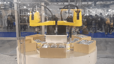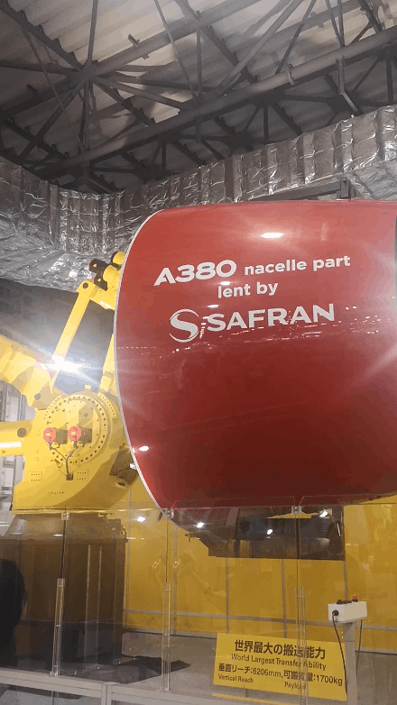 最夸张的是,发那科还搬来了世界载重量最大的机械臂,其完全伸展后的高度达到6.2米,最高搬运重量达1700公斤。 为直观显示这个大家伙的力量,发那科甚至找航空部件公司Safran借了半个空客A380的发动机。硕大无朋的机器臂挥舞着同样巨大的发动机部件,在空中上下和翻转,身临其境十分震撼。